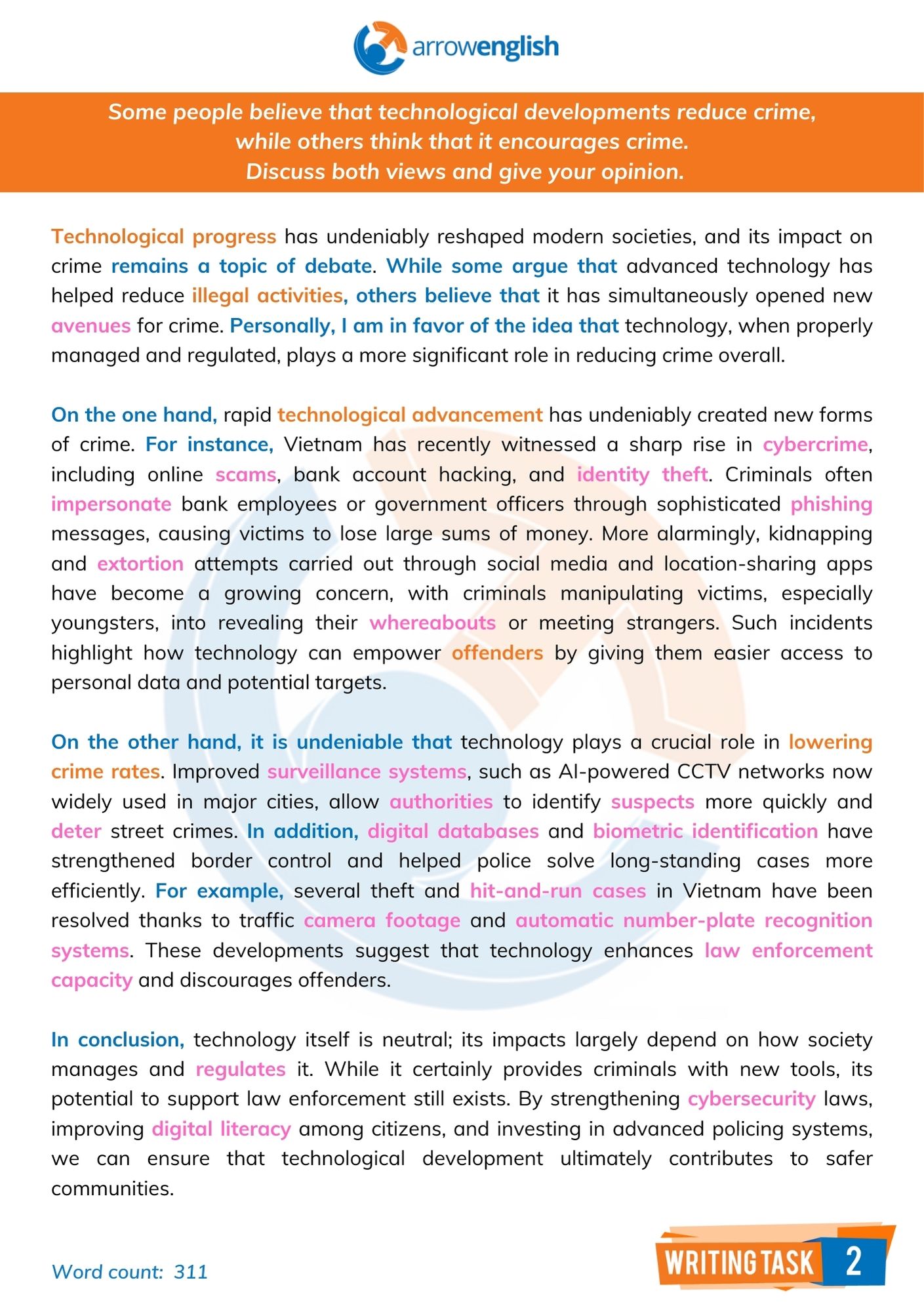 Một số người tin rằng những tiến bộ công nghệ giúp giảm tội phạm, trong khi những người khác cho rằng công nghệ lại tạo điều kiện cho tội phạm gia tăng. Hãy thảo luận cả hai quan điểm và đưa ra ý kiến của bạn.